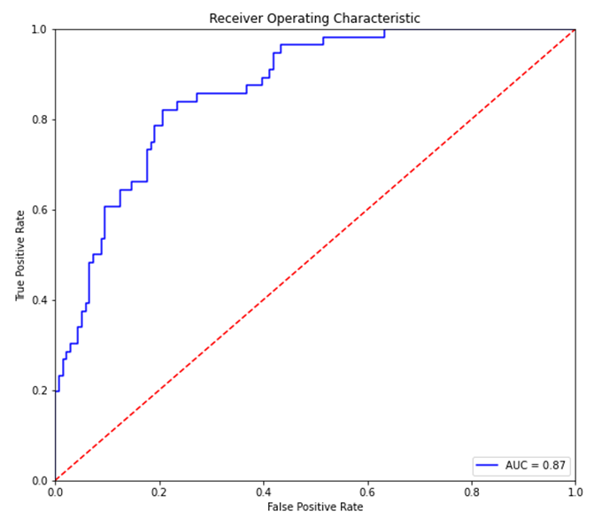 • The red line represents the results of a random classifier. The higher the blue line is compared to the red line, the better our classifier is.