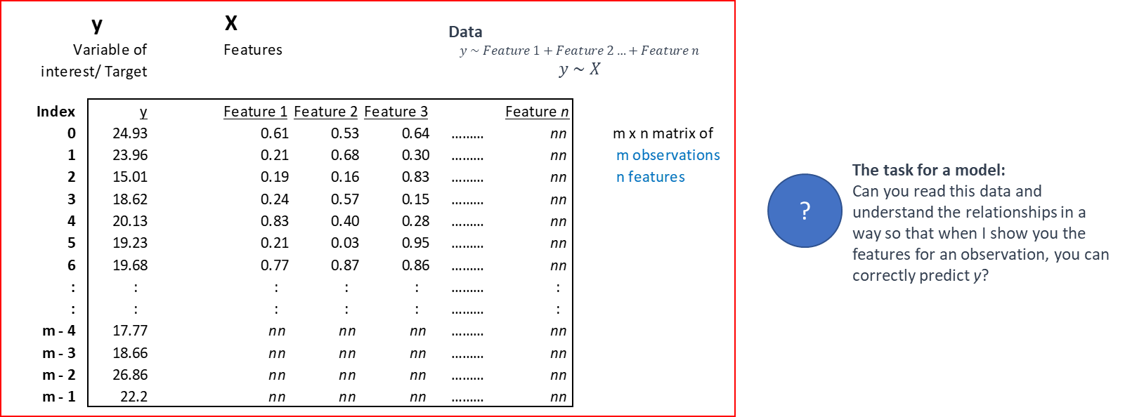 In some ways, building a model is akin to finding a function to describe a relationship, except that algorithm driven models allow us tremendous flexibility in the range of functions that can be modeled.