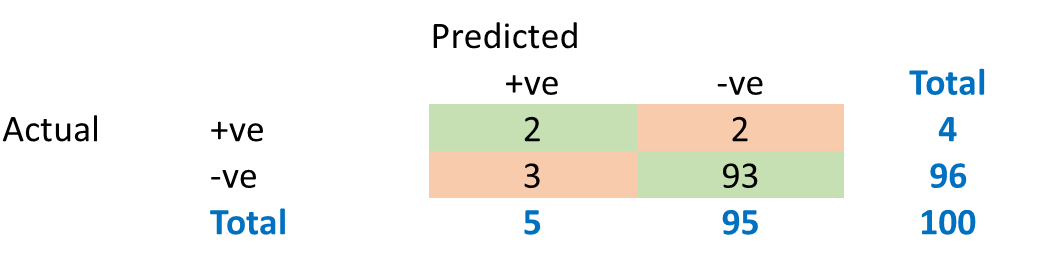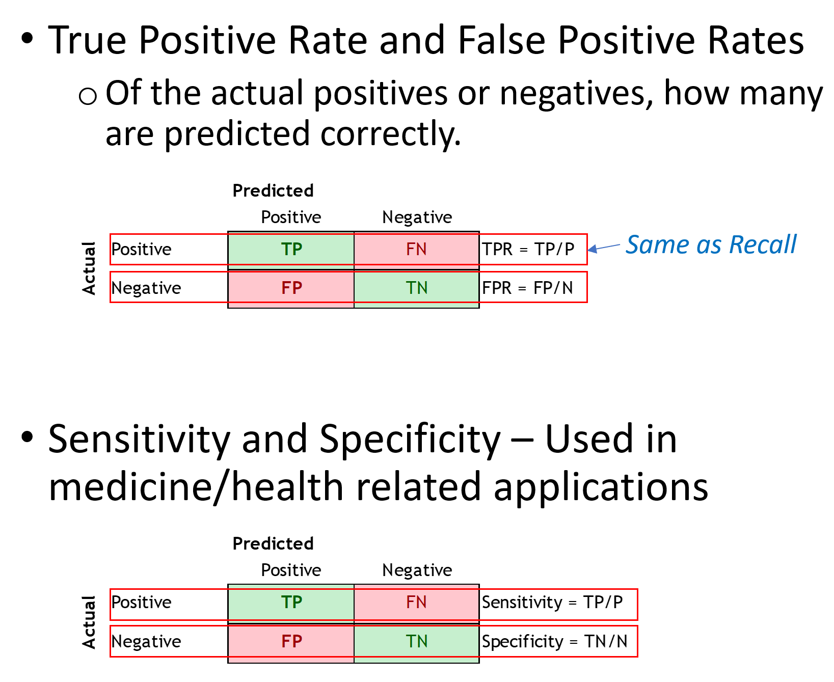 Sensitivity = TP/(TP + FN) = TP/P. Of those +ve, how many were correctly predicted +ve Specificity = TN/(TN + FP) = TN/N. Of those –ve, how many were correctly predicted –ve