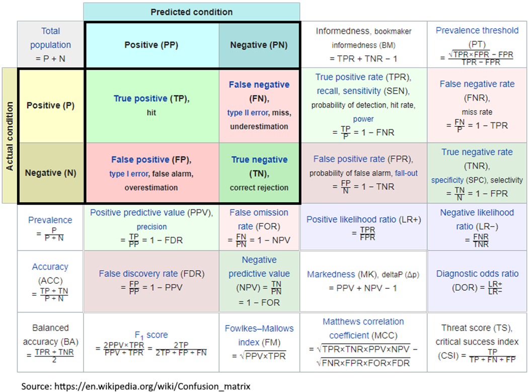 The Confusion Matrix can be sliced in multiple ways, and various combinations of ratios calculated. The Wikipedia has an interesting collection of a number of evaluation criteria – see graphic to the right.