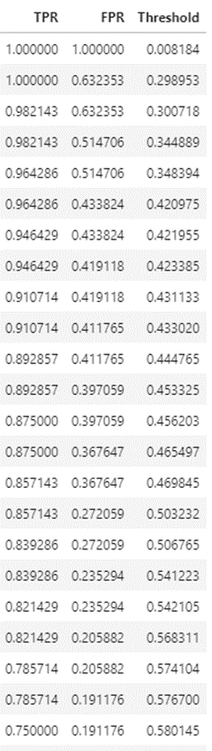 • The ROC curve is a visualization of the FP rate and the TP rate at different thresholds. Essentially, it is a plot of the table below.
