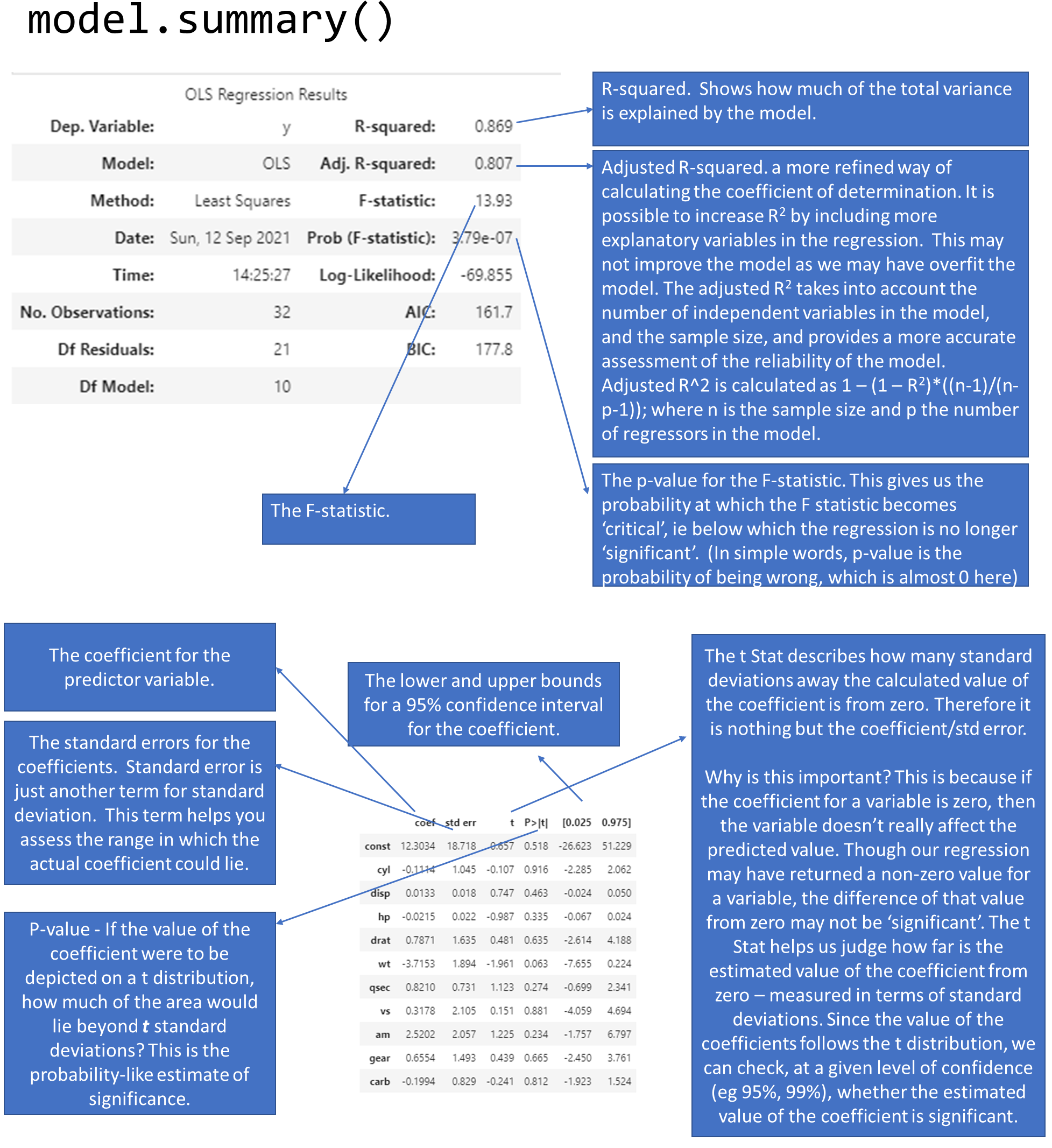 y = mtcars.mpg.values# sm.add_constant adds a column to the dataframe with 1.0 as a constantfeatures = mtcars.iloc[:,1:]X = sm.add_constant(features)
