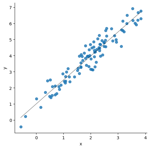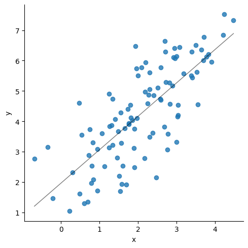 ### Update the below three linesmean = np.array([2,4])corr = np.array([.95])stdev = np.array([1, 1.5])size =100### Generate the numberscov = np.prod(stdev)*corrcov_matrix = np.array([[stdev[0]**2, cov[0]], [cov[0], stdev[1]**2]], dtype ='float')df = np.random.multivariate_normal(mean= mean, cov=cov_matrix, size=size)df = pd.DataFrame(df, columns = ['x', 'y'])# sns.scatterplot(data=df, x = df.iloc[:,0], y=df.iloc[:,1])sns.lmplot(data=df, x ="x", y="y", line_kws={"lw":1,"alpha": .5, "color":"black"},ci=1)print('Correlation matrix\n',df.corr())print(df.describe())print('\n', stats.linregress(x = df['x'], y = df['y']))