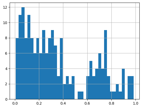 # A histogram of probabilities. Why not?pred_prob.hist(bins=40)