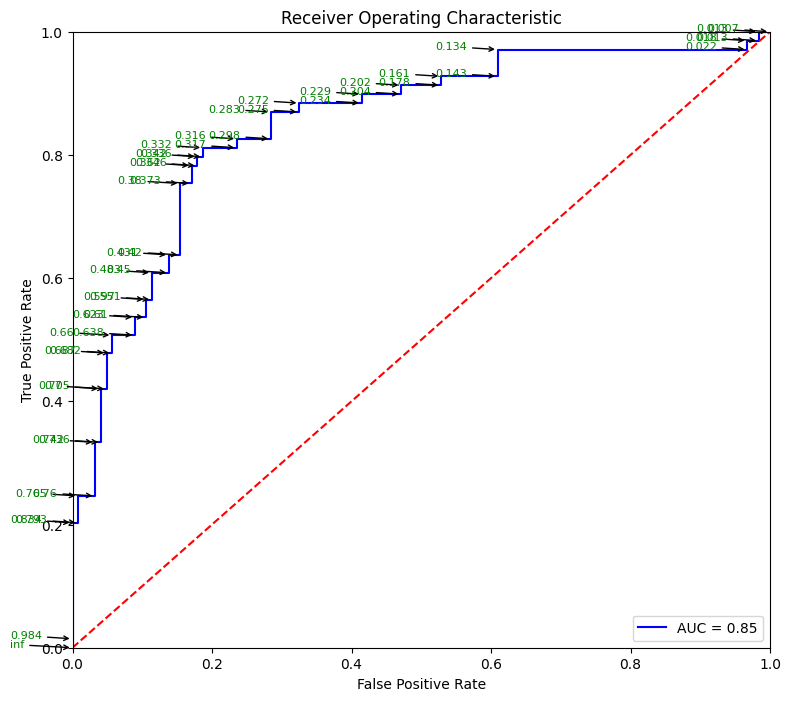 We get a probability estimate of about 5.6%, which we can evaluate based on our threshold.