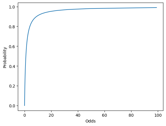 # Plotting Probability vs Oddsimport seaborn as snsimport matplotlib.pyplot as pltdf = pd.DataFrame({'Probability': np.arange(0,1, 0.01), \'Odds':np.arange(0,1., 0.01) /\ (1-np.arange(0,1., 0.01)) })sns.lineplot(data = df, x ='Odds', y ='Probability');