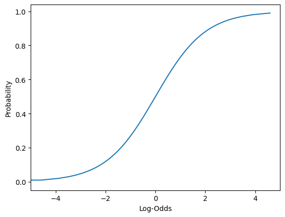 # Plotting log-odds# We add a very tiny number, 1e-15 (10 to the power -15) to avoid the divide by zero error for the log functionplt.xlim(-5,5)sns.lineplot(data = df, x = np.log(df['Odds'] +1e-15), y ='Probability',)plt.xlabel("Log-Odds");