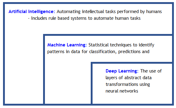 Artificial Intelligence is the widest categorization of analytical methods that aim to automate intellectual tasks normally performed by humans. Machine learning can be considered to be a sub-set of the wider AI domain where a system is trained rather than explicitly programmed. It’s presented with many examples relevant to a task, and it finds statistical structure in these examples that eventually allows the system to come up with rules for automating the task.