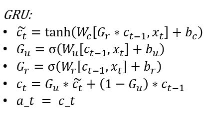 GRU = Gated Recurrent Unit The purpose of GRU is to retain memory of older layers, and persist old data in subsequent layers. In GRU, an additional ‘memory cell’ \(c^{<t>}\) is also output that is carried forward.