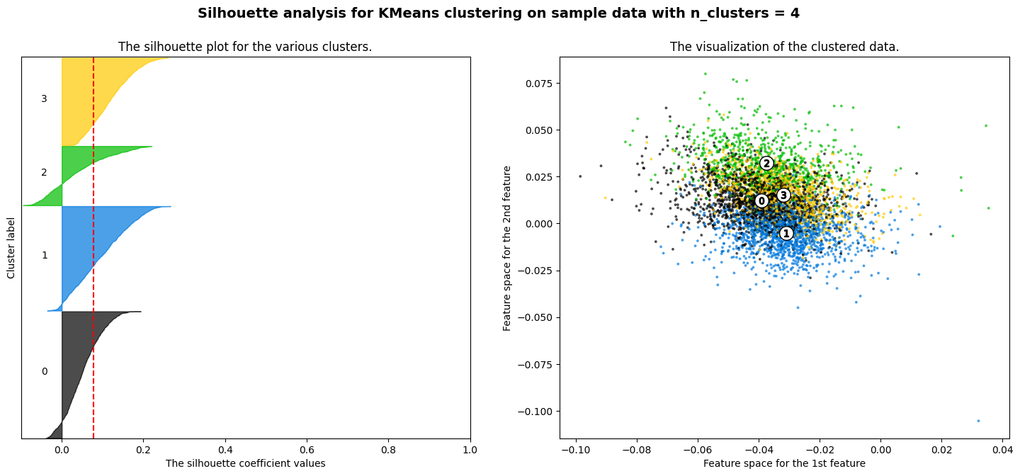 For n_clusters = 4 The average silhouette_score is : 0.0770754372934435