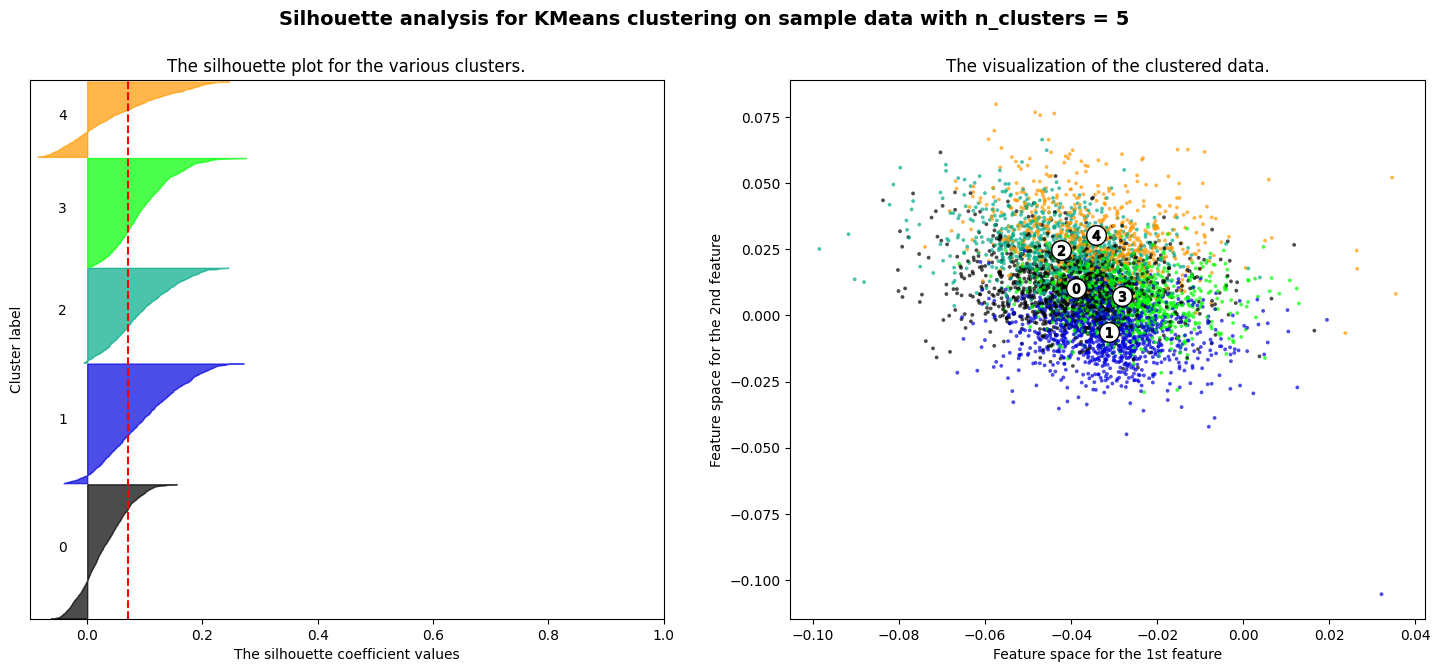 For n_clusters = 5 The average silhouette_score is : 0.07163005341517714